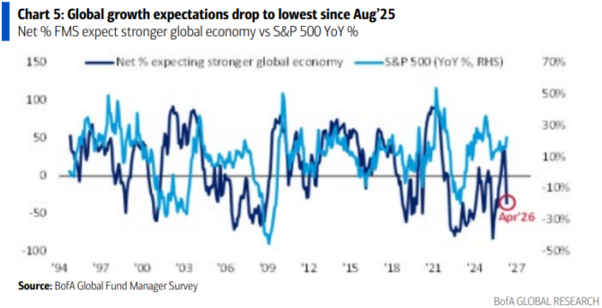 Noch stärker ging es in der Umfrage mit den globalen Wachstumserwartungen nach unten: Hier brach der Wert von netto +7 % auf -36 % regelrecht ein. Und im Februar, also vor dem Iran-Krieg, stand der Wert noch bei netto 39 %. („Netto“ heißt in diesem Fall, dass der Anteil derer, die ein Wachstum der Weltwirtschaft in den nächsten 12 Monaten erwarten, 39 Prozentpunkte größer war, als der Anteil derer, die einen Rückgang erwarteten, usw.)