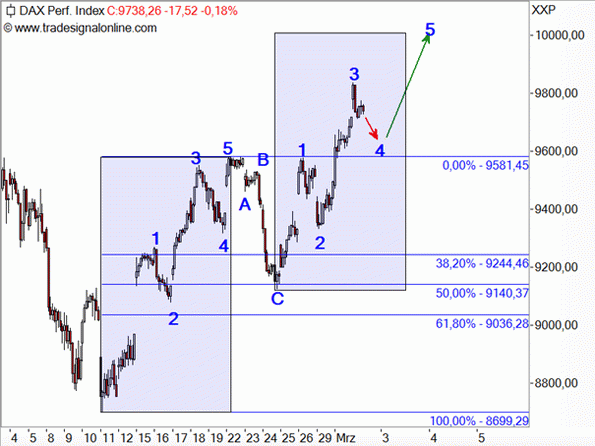 Für die Elliott-Wellen-Analyse (siehe Börse-Intern vom 26.02.2016) bedeutet dies, dass nach der abgeschlossenen 5-gliedrigen Aufwärtsbewegung (linkes Rechteck im Chart) lediglich eine ABC-Korrektur stattfand, der nun wieder eine neue 5-gliedrige Aufwärtswelle folgt (rechtes Rechteck).