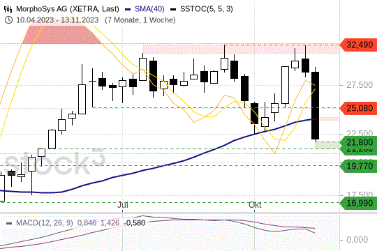 Heute gilt mein Blick dem Aktienkurs der MorphoSys AG. Die Titel sind am Donnerstag um elf Prozent eingebrochen! Zu Wochenschluss hin setzt sich die Kursschwäche fort. Eine Aktie der MorphoSys AG notierte am Freitag, 17. November zum Börsenschluss in Frankfurt (Xetra) bei 22,08 EUR (-5,4%).Die AusgangslageOben abgebildet: der Wochenchart der MorphoSys-Aktie. Jede Kerze spiegelt damit das Kursverhalten einer Handelswoche wider....