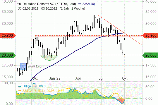 …...Rohstoffe! Heute soll es um den Basiswert Dt. Rohstoff AG (WKN: A0XYG7) gehen. Kurs der Dt.-Rohstoff-Aktie am Freitag, 7. Oktober 2022 zum Handelsschluss am Börsenplatz Frankfurt: 24,80 EUR (+1,2%).
