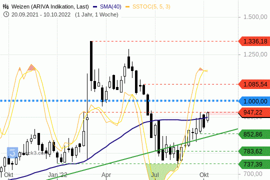 Die Ausgangslage. Mit aktuellen Preisen ~940 US-Cent bewegt sich die Weizen-Kursnotierung weiterhin oberhalb ihres Aufwärtstrends, der sich bis in den Juni 2020 zurückverfolgen lässt. Der Kriegsbeginn in der Ukraine ließ den Weizen-Preis Anfang März bis auf 1336 US-Cent je Scheffel hochschnellen. Aktuell erkennen Chartisten im Weizenpreis jedoch eine leicht überkaufte Marktsituation.