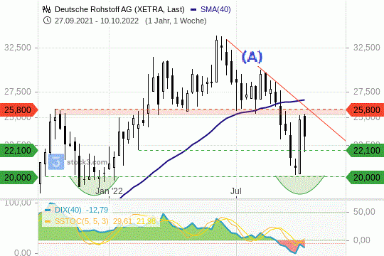 ...Rohstoffe! Heute soll es um den Basiswert Dt. Rohstoff AG (WKN: A0XYG7) gehen. Der Titel zeigt sich zum Wochenschluss hin (wieder) extrem stark! Kurs der Dt.-Rohstoff-Aktie am Freitag, 14. Oktober 2022 zum Handelsschluss am Börsenplatz Frankfurt: 22,90 EUR (+1,3%).