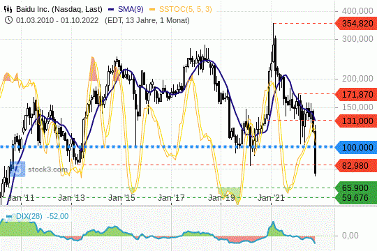 ...Emerging Markets! Auf geht’s nach China – werfen Sie mit mir einen Blick auf die Baidu Inc. (WKN: A0F5DE). Der Titel befindet sich im Crash-Modus! Die Baidu-Aktie am Montag, 24. Oktober 2022 im Nachmittagshandel in New York: 76,30 USD (-16,3%).
