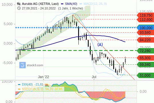 Die Ausgangslage. Vor rund fünf Wochen bereits hat sich bei den Papieren der Aurubis AG eine Bodenbildung formiert. Diese ging vom Jahrestief bei 51 EUR aus. Seither konnten sich die Notierungen bis auf ~ 66 EUR hocharbeiten. Dabei wurde in der Vorwoche bereits eine Abwärtstrendlinie (A) durchstoßen. Der MACD-Trendfolgeindikator auf wöchentlicher Betrachtungsbasis ist positiv zu bewerten.