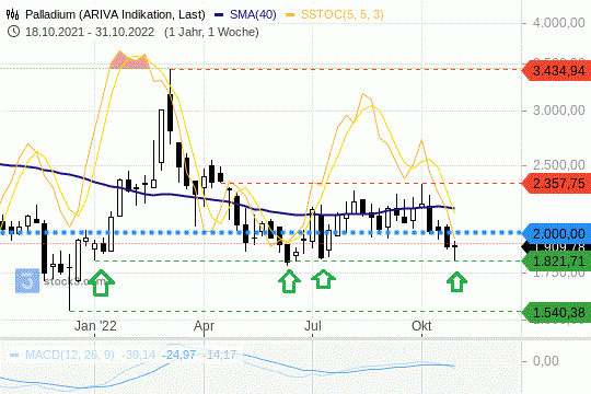 ...Rohstoffe! Heute gilt mein Blick dem Edelmetall Palladium. Der Palladium-Preis am Mittwoch, 2. November 2022: 1856 USD (-1,4%).