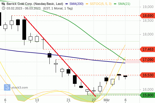 Heute geht’s um Gold, beziehungsweise um den Goldminenwert Barrick Gold (WKN: 870450). Die Barrick-Gold-Aktie am Montag, 6. März 2023 (16 Uhr MEZ) am Handelsplatz New York: 16,38 USD (-0,9%).