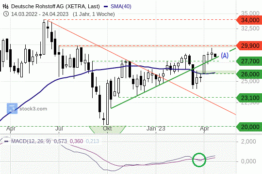 was gibt’s Neues in/aus der Welt der Rohstoffe, Emerging Markets und Devisen? Aktuell im Fokus der Investoren: die Rohstoffe! Heute soll es um den Basiswert Dt. Rohstoff AG (WKN: A0XYG7) gehen. Der Titel zeigt sich zu Wochenbeginn mit dem allgemeinen Marktverhalten schwach, liegt aber noch immer gut im Aufwärtstrend! Kurs der Dt.-Rohstoff-Aktie am Montag, 24. April 2024 zum Börsenschluss am Handelsplatz Frankfurt (Xetra): 28,40 EUR (-1,4%).