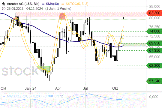 Oben abgebildet: der Wochenchart. Deutlich erkennt man den kräftigen Kursschub, der bereits die vierte Woche in Folge anhält. Beeindruckend finde ich ja die letzte Kerze; diese zeigt den Kursverlauf der aktuellen Handelswoche – kräftiger kann eine Woche kaum beginnen. Unterstützung kommt sowohl vonseiten des MACD-´Trendfolgeindikators – dieser ist positiv zu bewerten – als auch vonseiten der 200-Tagelinie, die wieder aufwärts dreht und zunehmend den Preisbereich um 70 EUR in seiner Eigenschaft als Unterstützung verstärkt. Charttechnisch habe ich jetzt den Preisbereich um 81,00 / 82,30 EUR als nächstes Kursziel im Visier. Spätestens dann aber sollten sich Anleger aber auf eine Konsolidierung / einen Seitwärtstrend einstellen. Denn die Gefahr einer Kursüberhitzung liegt nach dem jüngsten Höhenflug auf der Hand. Charttechnisch aber überzeugt mich die Aurubis-Aktie auch langfristig.