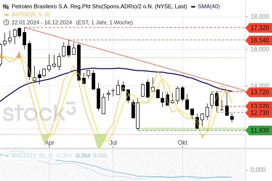 Charttechnisch bleibt die Ausgangslage bei Petrobras grundsätzlich als kritisch zu beurteilen. Der MACD-Trendfolgeindikator hat wieder nach unten abgedreht und bestätigt die vorherrschende Abwärtsbewegung. Für eine Trendwende nach oben bedürfte es schon eines Sprungs über die 15er-Preismarke. Rutscht der Kurs unter 12,90 USD, so wäre dies stark negativ zu bewerten. Die Aktie bleibt damit – vorerst – primär ein Spielball risikoliebender Trader.