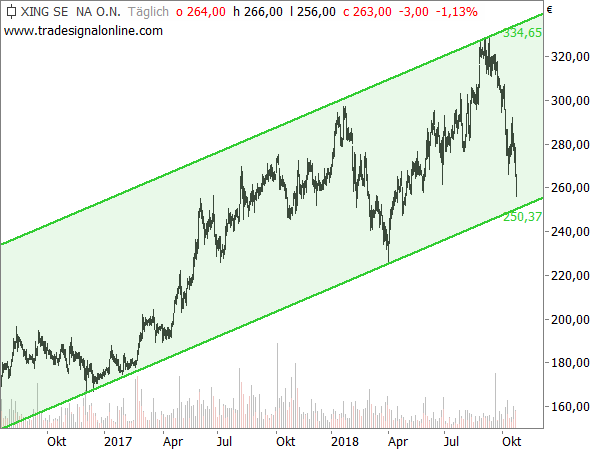 Xing befindet sich seit 2015 in einem klaren, lupenreinen Aufwärtstrend. Trader lieben solche Aktien. Unten an der unteren Linie einsteigen und einfach warten bis die Aktie die obere Trendlinie erreicht und dann aussteigen, um später wieder am unteren Ende einzusteigen – so die Theorie.