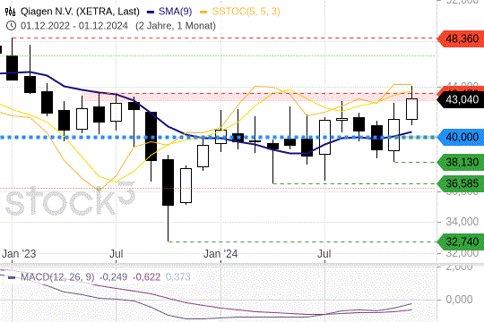 Ich liebe Monatscharts, zeigen sie mir doch die längerfristige Kursentwicklung eines Basiswertes. Und diese Kursentwicklung bei Qiagen hat es voll in sich. Seit einem Jahr nämlich tendiert die Notierung seitwärts und wird durch einen harten Widerstand um 43 EUR in Schach gehalten.