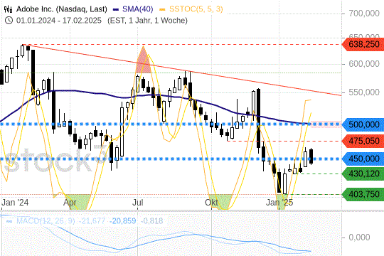 Oben abgebildeter Wochenchart zeugt von der starken Kurserholung der Aktie seit Januar. Die Notierung kletterte innerhalb von nur fünf Wochen von 403,75 USD bis auf 465,70 USD (+15%). Damit schien der vorhergehende Kurseinbruch überwunden. Während die 450er-Preislinie über Monate hinweg einen Widerstand darstellte, wurde diese Schlüsselmarke vor zwei Wochen erst nach oben durchbrochen – ein grundsätzlich positives Signal! Ein Signal aber, welches sich im Nachgang als Fehlsignal(!) erwiesen hat. Denn die Vorwoche präsentierte sich für die Adobe-Aktie sehr schwach; der Titel verlor im Wochenverlauf 3,9 Prozent an Wert; davon entfielen alleine -2,3 Prozent auf den Freitagshandel.