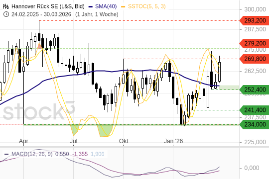 Mein Fazit: Die Aktie der Hannover Re SE zeigt sich in einem schwachen Marktumfeld bemerkenswert stabil. Charttechnisch haben wir eine saubere Range mit klaren Trigger-Marken. Für kurzfristige Trader bietet sich damit ein klassisches Range-Trading an: Ein Ausbruch über 270 EUR könnte Momentum auf die Oberseite bringen, während ein Rutsch unter 254 EUR das Bild eintrüben würde. Fundamental bleibt die Aktie solide aufgestellt, was zusätzliche Stabilität gibt. Wichtig bleibt ein konsequentes Risikomanagement, da der Gesamtmarkt aktuell Schwäche zeigt.